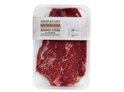 Стейк из говядины Matured Beef от коров породы Black Angus. Денвер стейк нарезается из филе шейного отруба и обладает высокой мраморностью. Среди прочих стейков Денвер выделяется своей необычной продолговатой формой и крупными волокнами. Вкусовые качества мяса лучше всего раскрываются при прожарке Medium.